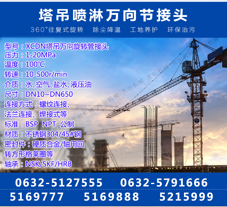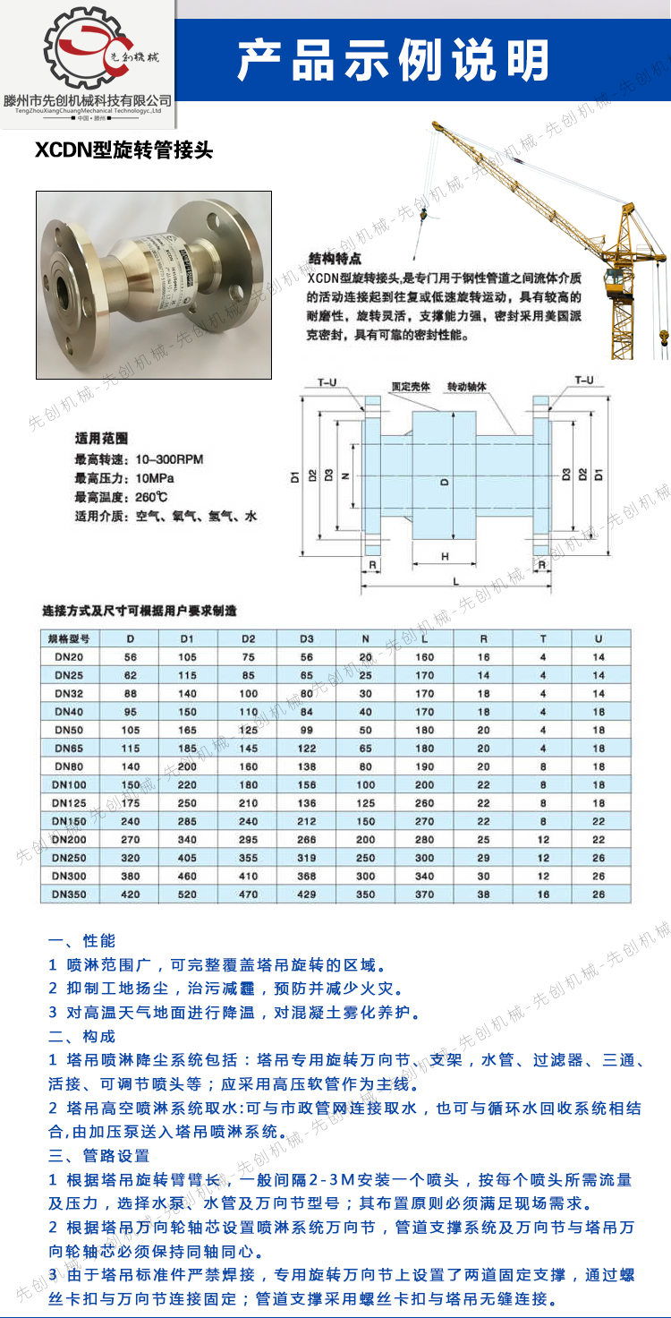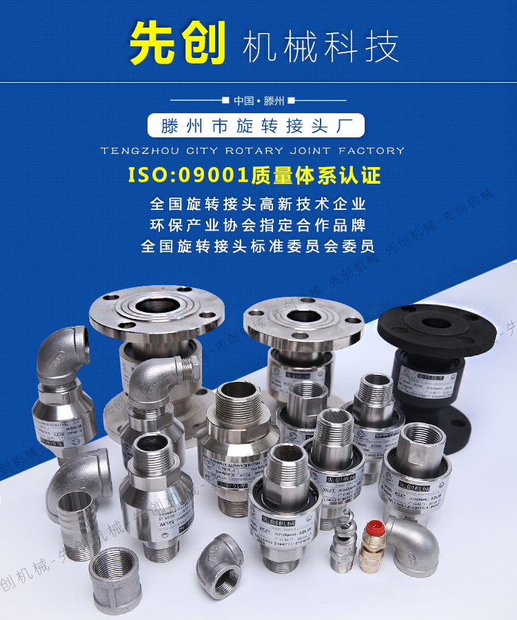 工作温度: 回转旋转接头正常情况下我们的旋转管接头可以承受的工作温度为40℃至400℃ 工作压力: 正常工作压力范围为10至315bar 工作转速: JSDN型旋转管接头设计时考虑的是较慢的转速,一般情况为ηmax=20—30min-i,这种转速下可保证封特殊情况下的转速可达ηmax=280-30min-i